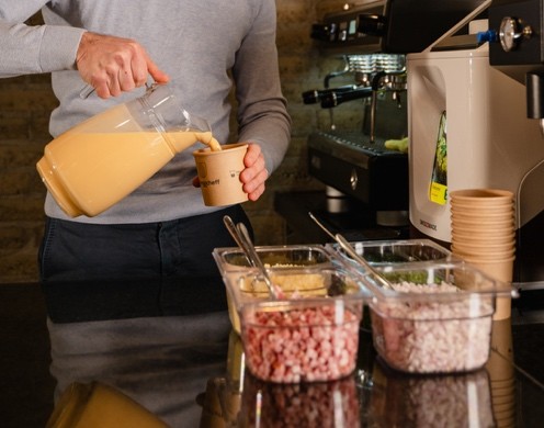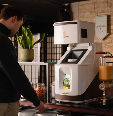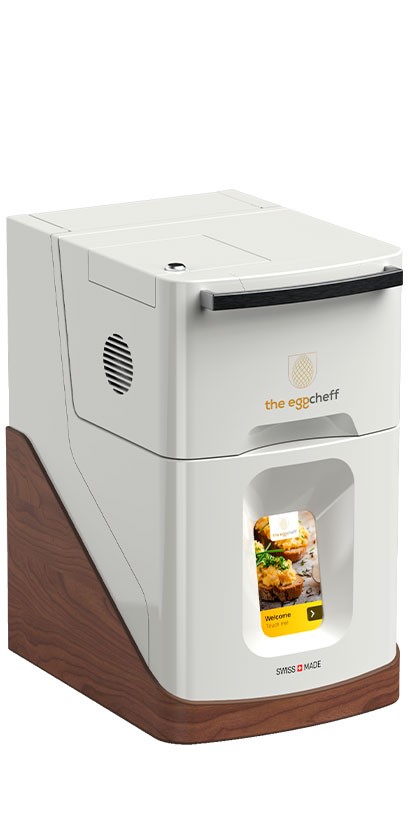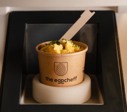The Scrambled Eggcheff prepares fresh scrambled eggs in a cup in just one minute. Everytime perfectly made due to it’s patented heating-stirring technology and sensor based cooking. The device cooks pasteurized egg mix including fresh ingredients and automatically stops when the egg is perfectly cooked.