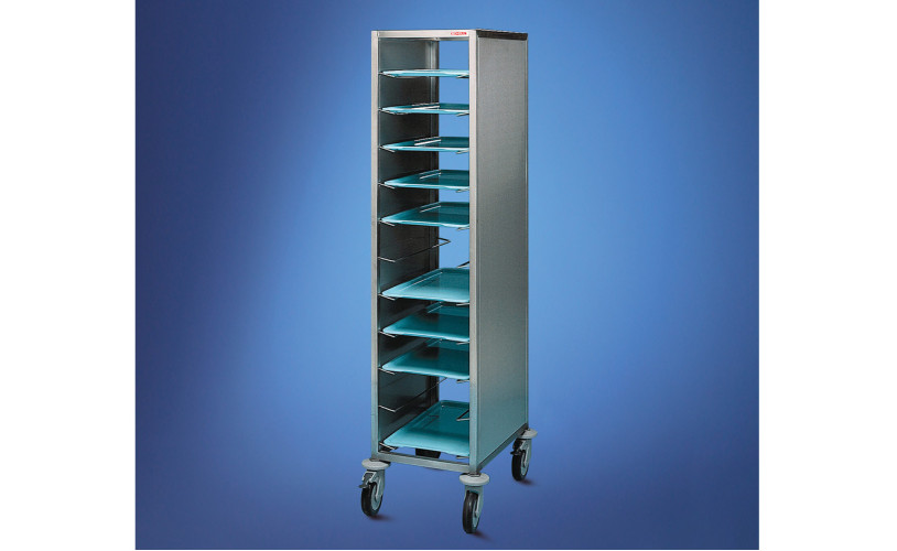 Design: Frame structure made of chrome nickel steel square tubes 25 x 25 mm, completely welded. Tray supports made of chrome nickel steel angle material. Mounted on 4 corrosion protected, ball bearing castors. 2 of them lockable. 4 distance holding bumpers. Height distance of tray supports 125 mm. Also available with stainless steel doors (stainless steel facing closed all around).