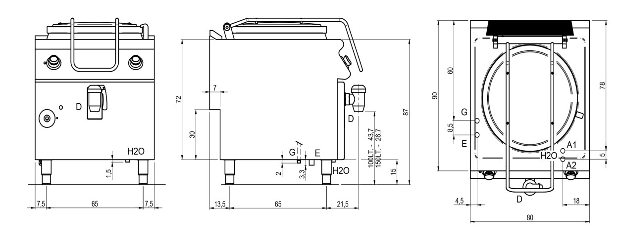 Side panels, bottom and back made in stainless steel. Top made in stainless steel AISI 304 20/10. Rear flue made in enamelled cast-iron. Cooking bottom in stainless steel AISI 316 and walls in stainless steel AISI 304. Activation and control of heating by an energy regulator. The load of water is via solenoid valves activated by the remote control panel with dispenser on the cooking bottom. Water filling by adjustable tap. 2 inch drain with safety handle in athermic material. Balanced lid with a large front athermic handle. The burners are made of stainless steel AISI 304, external to the tank or to the interspace. The gas supply is controlled by valved tap with power and thermocouple control on the front panel, and electric ignitor. Special designed knobs to avoid water penetration in the control panel.