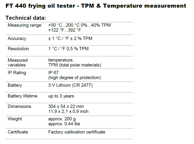 The FT 440 easily, quickly and reliably determines the quality of your oil. To do so, it measures the so-called „Total Polar Material“ (TPM) content in the oil and shows its value as an accurate percentage. The clear alarm via the coloured top alarm light makes it even easier to evaluate the quality of the oil. So you always know exactly when to change your oil. The FT 440 frying oil tester prevents the direct exposure of your hand to the hot oil.
